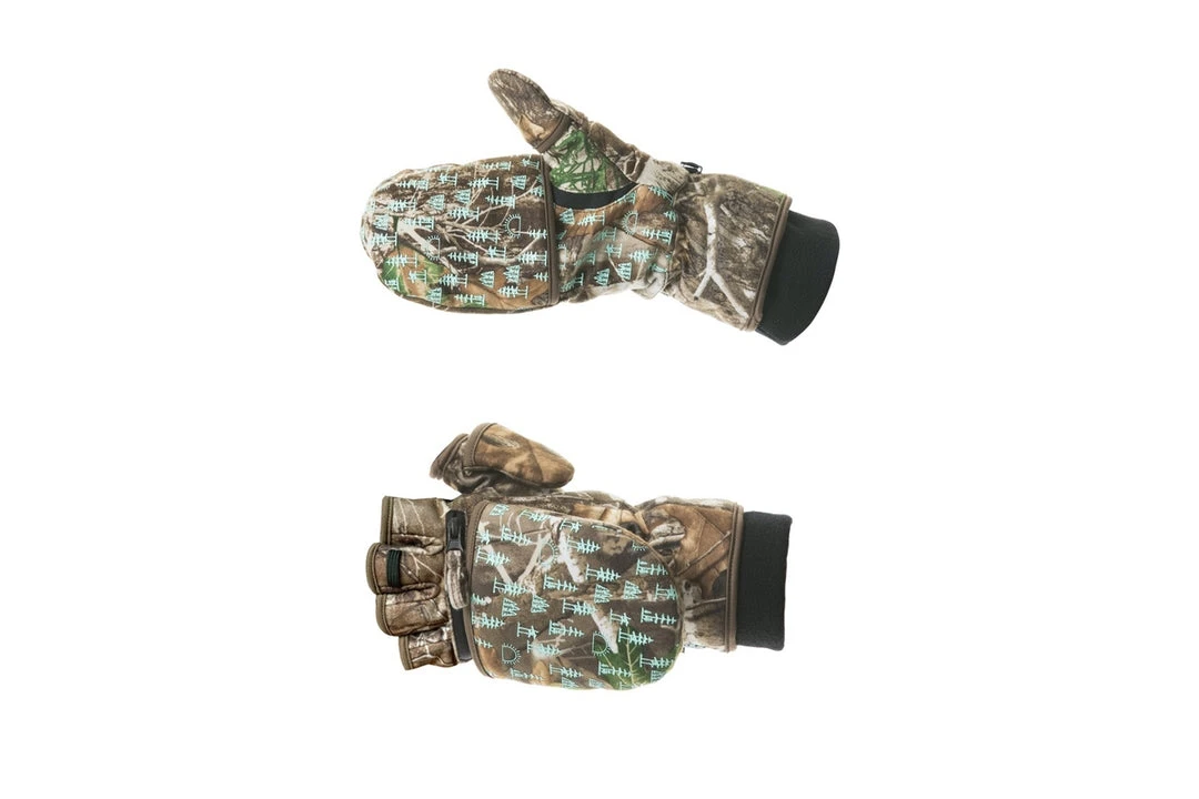 This flip top mitten, which converts from a mitten to a fingerless glove, features quiet brushed tricot windproof material in 3 color choices: Realtree Edge®, Blaze Orange, and Blaze Pink. It has a soft fleece cuff, silicone grip palm and a zip pocket on the back of the hand to add a heat packet or open of venting.