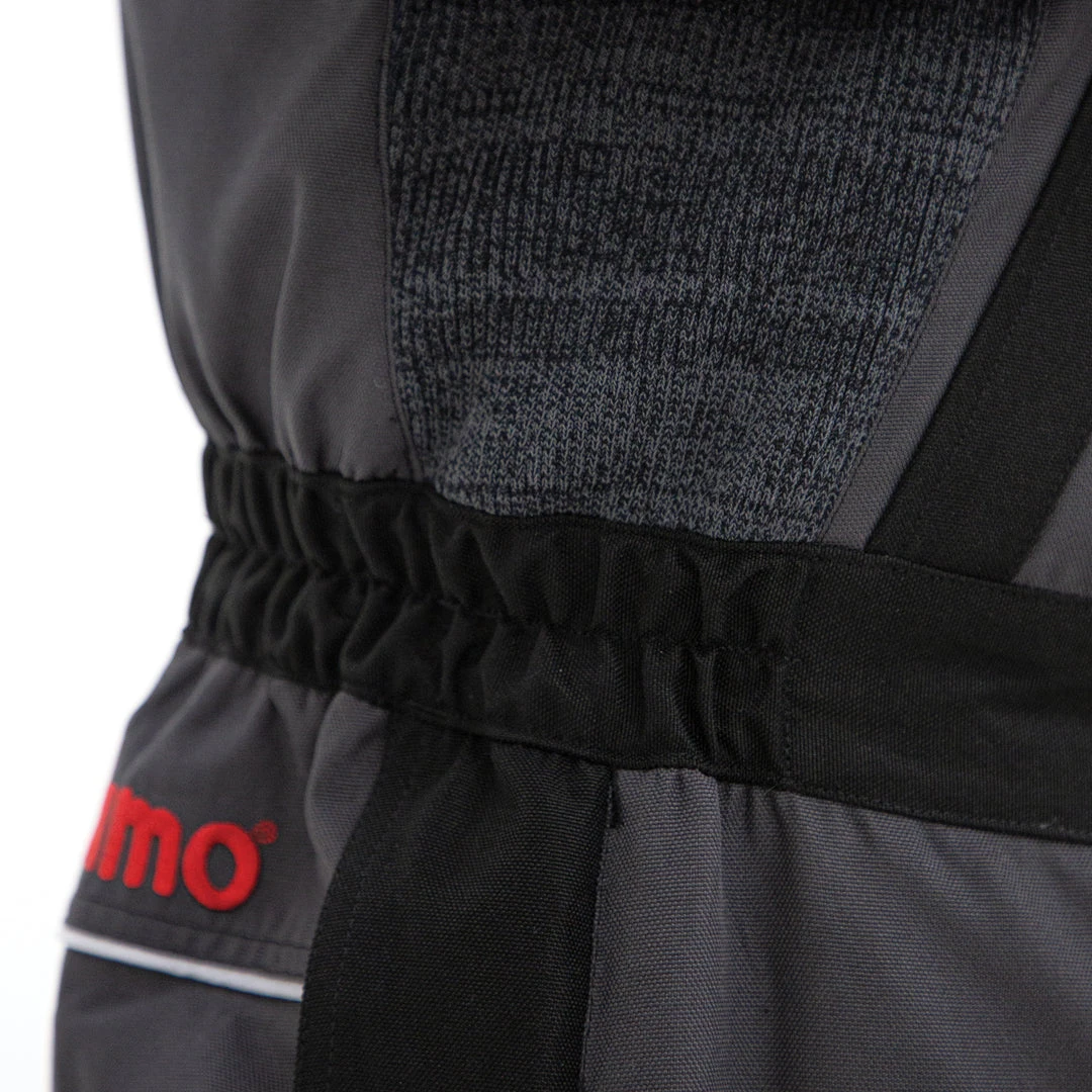 - Adjustable, no-slip shoulder straps, stretch torso side panels with partial elastic waistband, diamond-shaped crotch gusset, and contoured knees.