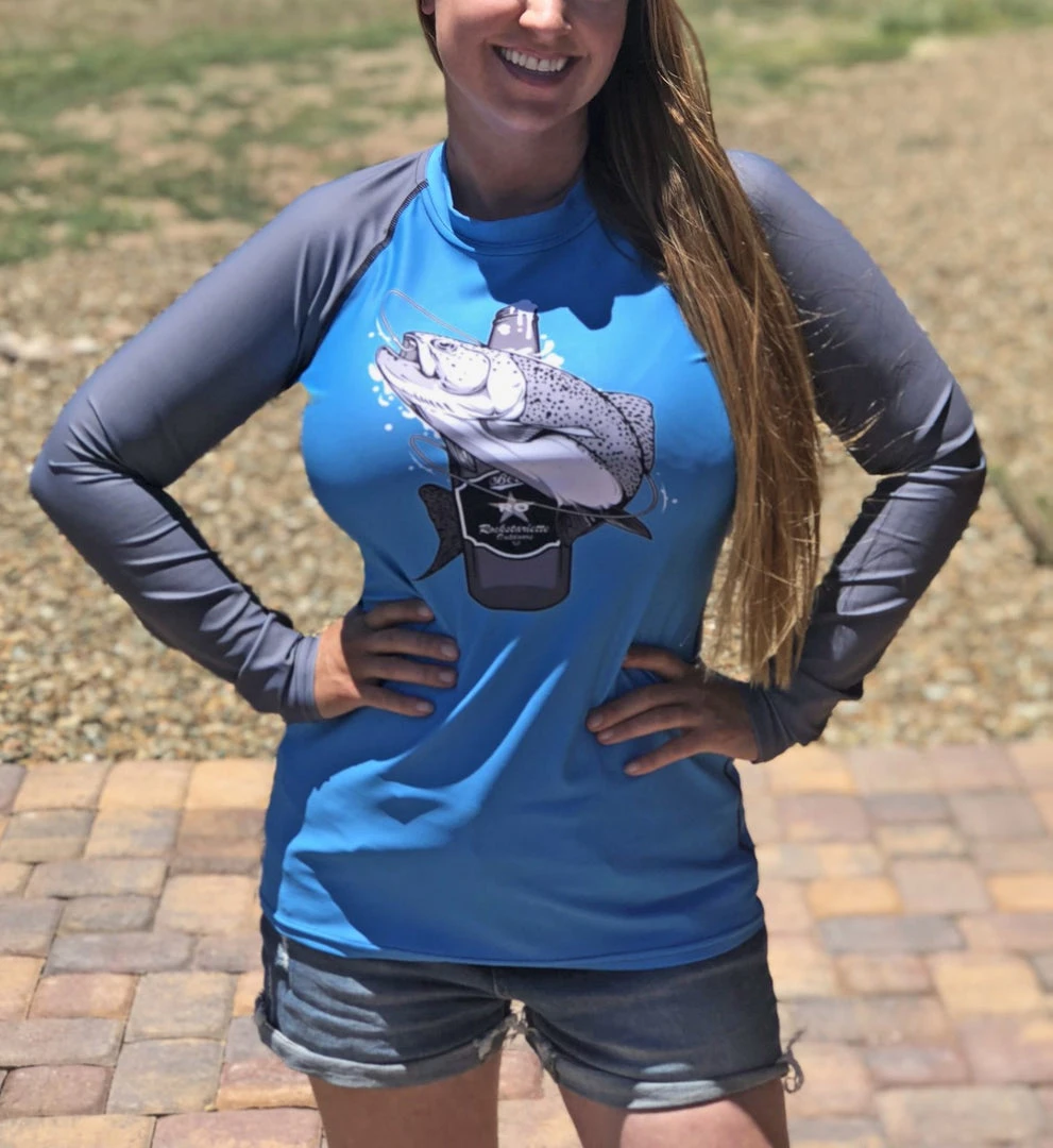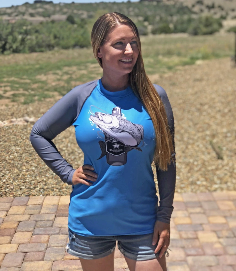 Fishing and Beer Logo Rash Guard Long Sleeve Sun Shirt! Perfect for swimming, fishing, surfing and biking! 38-40 UPF (This shirt blocks both UVA and UVB rays). Made from our unique polyester / spandex, moisture wicking, quick dry fabric. Grey sleeves with blue center. Large logo on front and small logo in center of upper back.